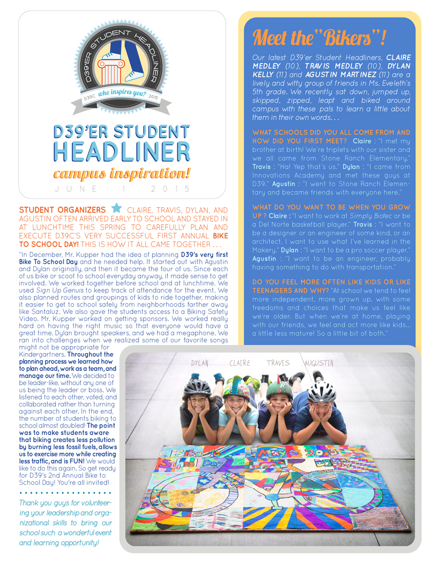 CLAIRE MEDLEY (10), TRAVIS MEDLEY (10), DYLAN KELLY (11) and AGUSTIN MARTINEZ (11) are a lively group of friends in Ms. Eveleth’s 5th grade who spent much of the spring arriving early to school and staying in at lunchtime to carefully plan and execute D39C’s first annual Bike To School Day! They volunteered their leadership and organizational skills to bring our school a wonderfully successful event that also provided a great learning opportunity. Thank you guys!
